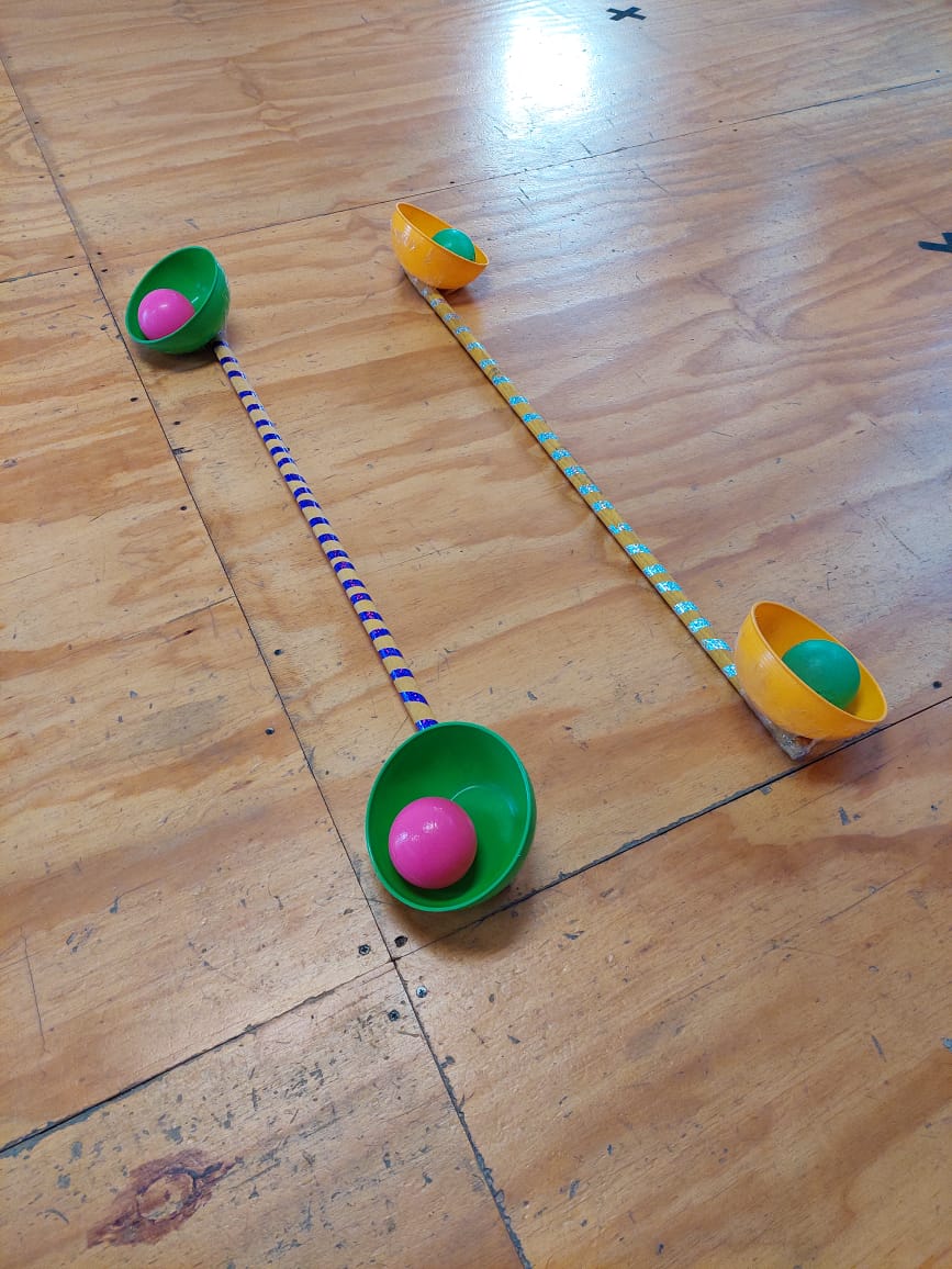 Liberación Campesina: En la escuela Liberación Campesina, los profesores se dieron a la tarea de crear un implemento para trabajar el equilibrio y la fuerza, además de incentivar el trabajo en equipo. Llegaron a este implemento que consiste de un palo de escoba forrado, 2 recipientes ó jícaras, una pelota de plástico y diúrex.